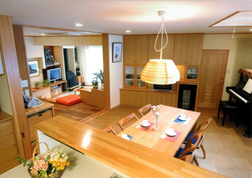 既存の躯体は出来る限り残し、補強して再生したダイニング。家族室から畳コーナーまで続き間となっています。